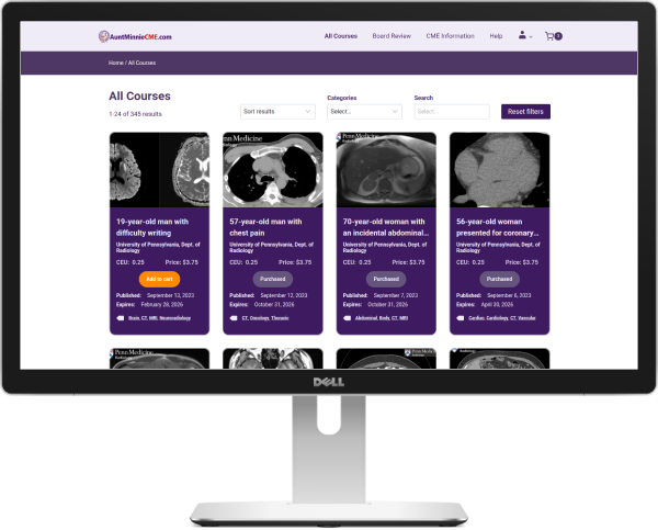 AuntMinnieCME.com offers a convenient, efficient, and cost-effective way to stay current with your radiology CME. Explore hundreds of radiology CME courses, easily sortable by modality or subspecialty category. Most courses are delivered in bite-sized 15-minute segments, perfect for busy professionals. You only pay for the credits you need, and each individual course certificate is saved in your account for easy access.